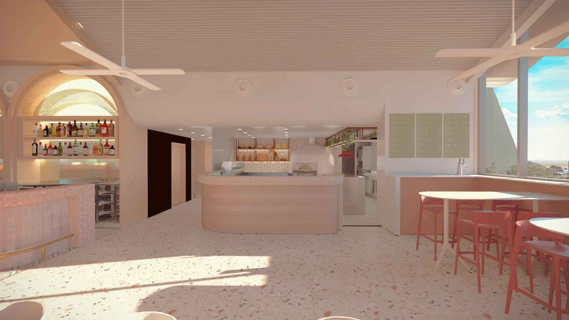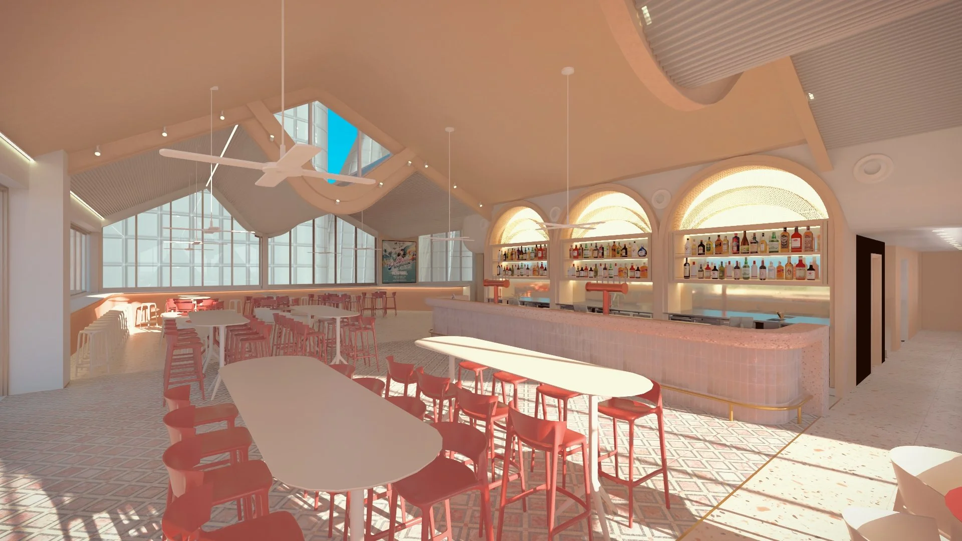 The design concept centres around a unique rooftop bar and dance floor that pulses with energy from day to night. A sculptural DJ booth, organically formed into the interior architecture, acts as both a performance stage and a striking design feature. Rather than appearing as a standalone insert, the booth emerges seamlessly from the built form, reinforcing the immersive and cohesive aesthetic. Dynamic lighting, layered textures, and bold material selections heighten the sense of movement and rhythm throughout the space.