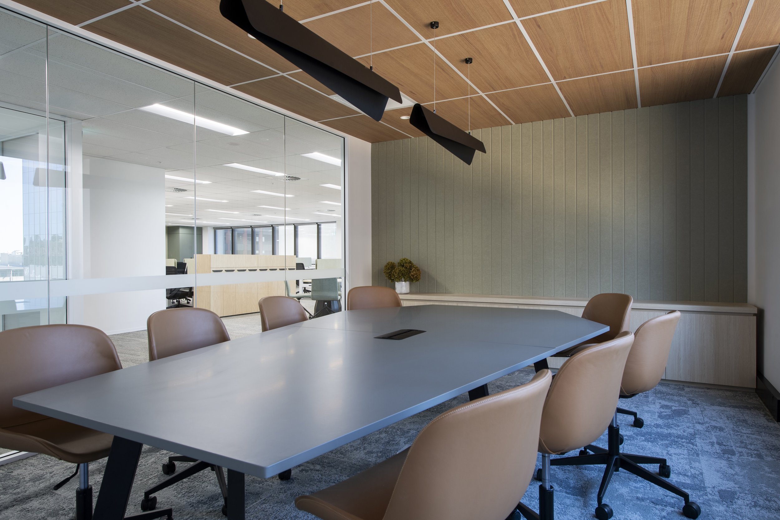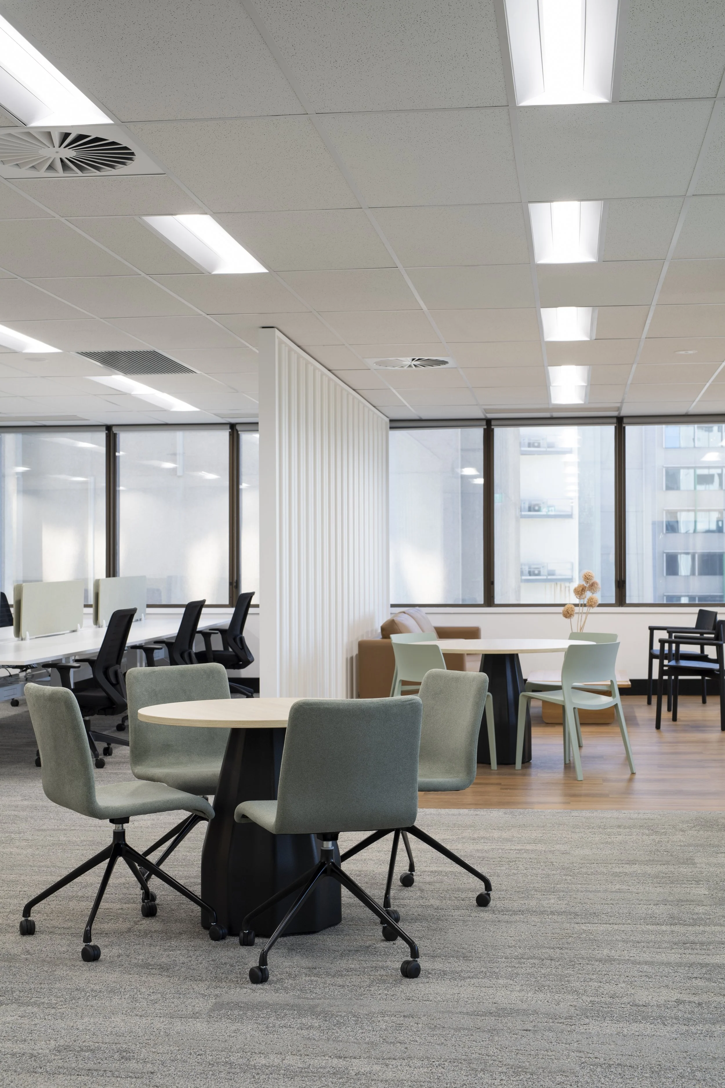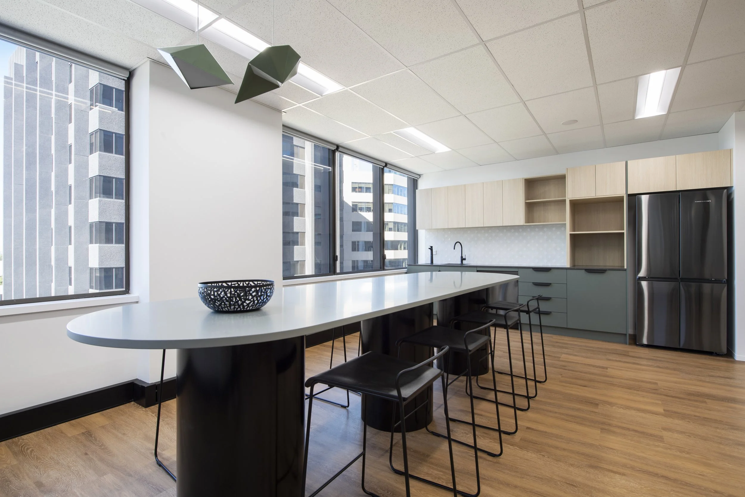 This workspace fitout is defined by a calm, neutral palette layered with soft green tones, creating an inviting and grounded workplace environment. Expansive views across the Swan River draw natural light deep into the floorplate, reinforcing a connection to Perth’s landscape and enhancing the overall sense of wellbeing.