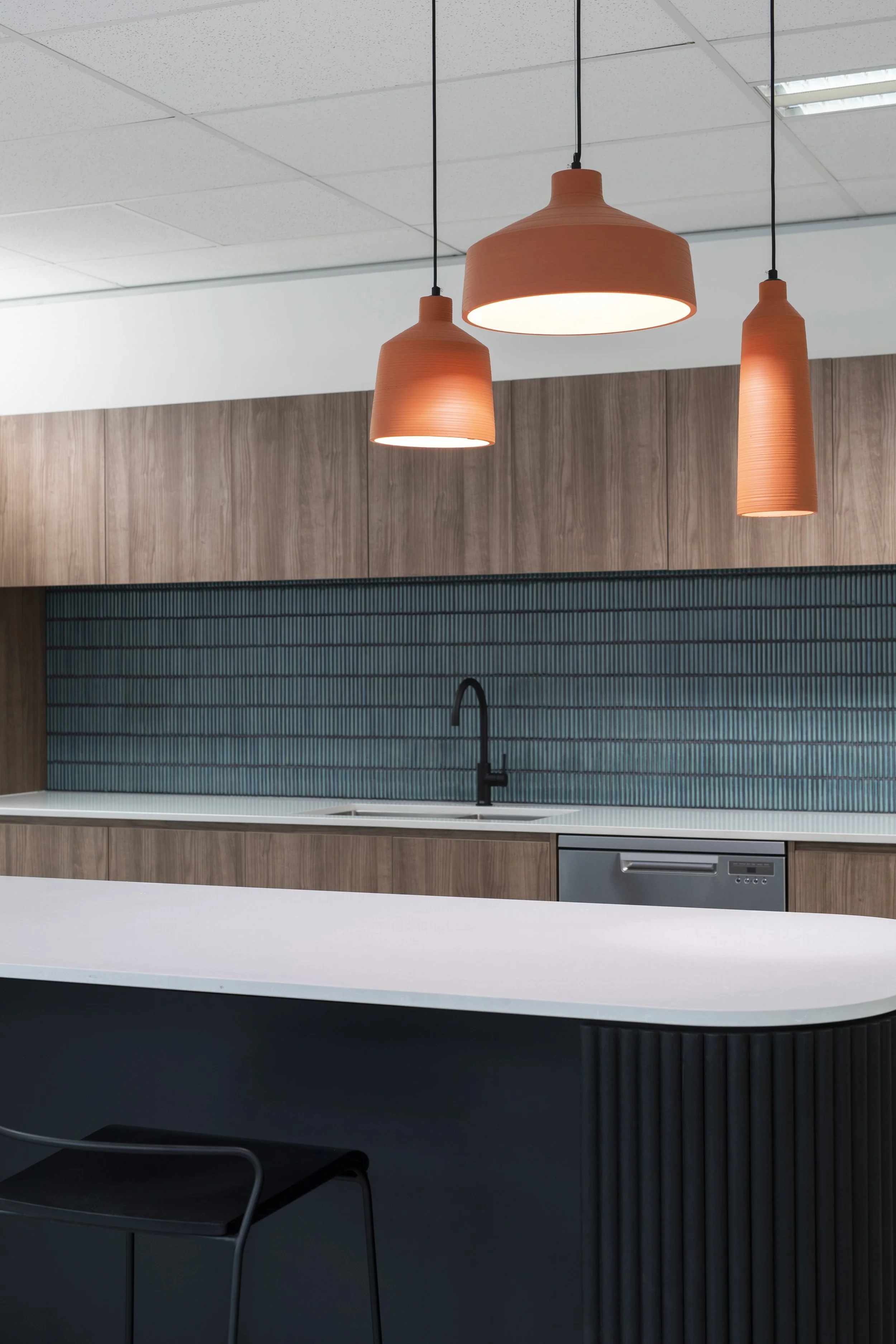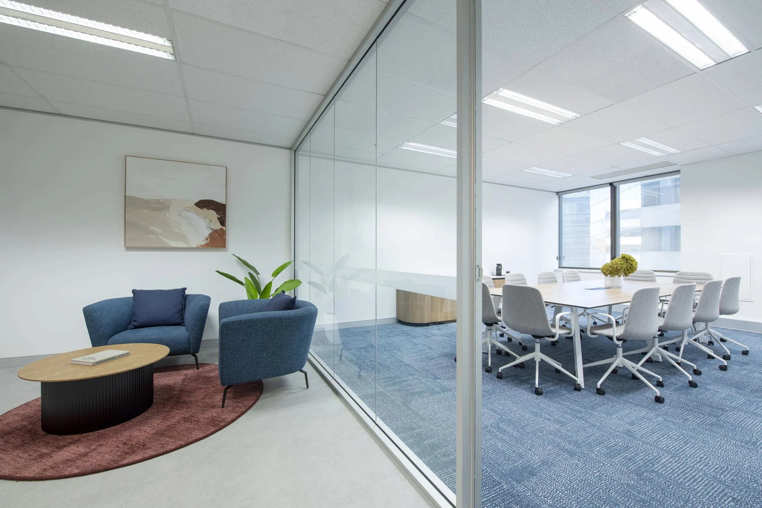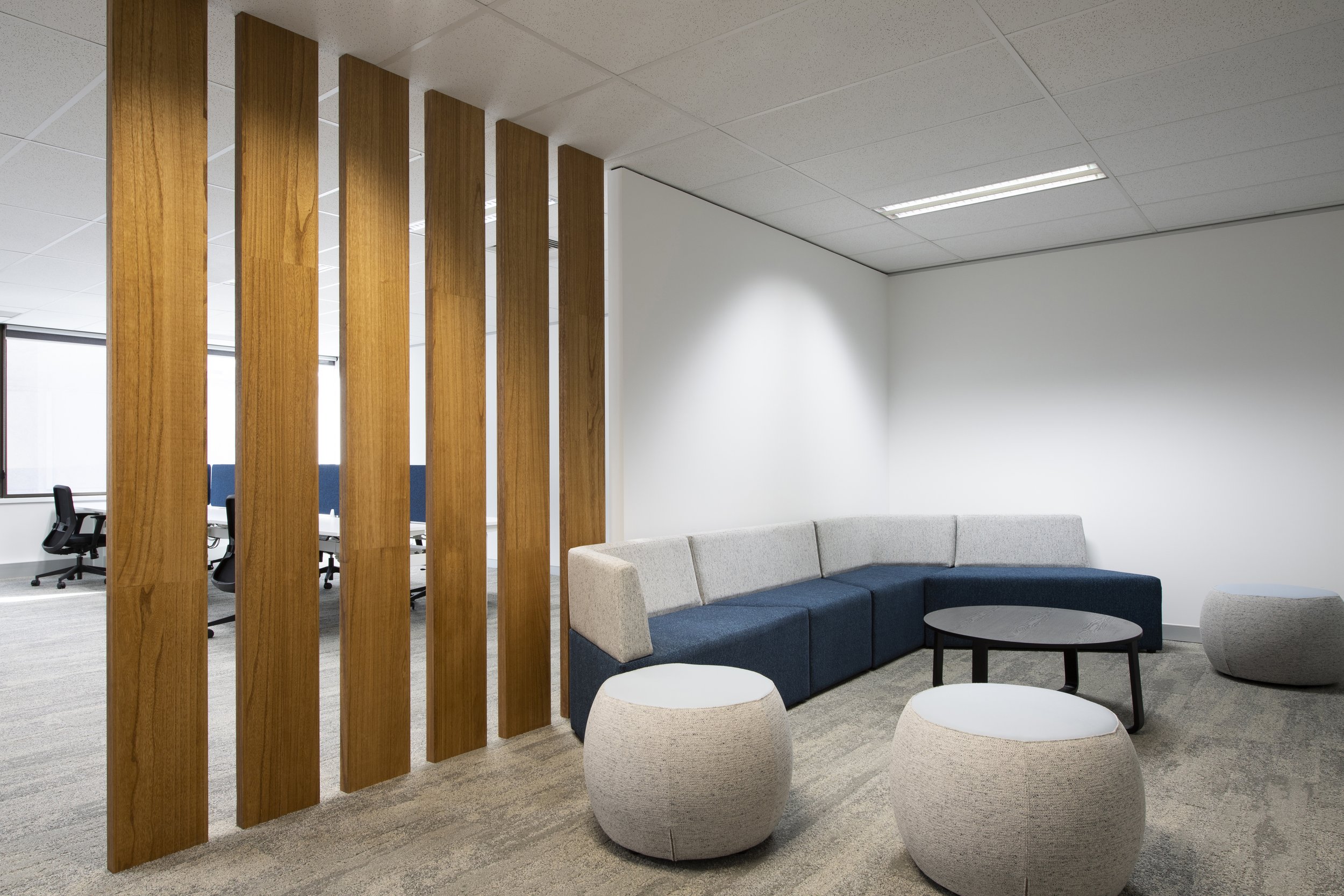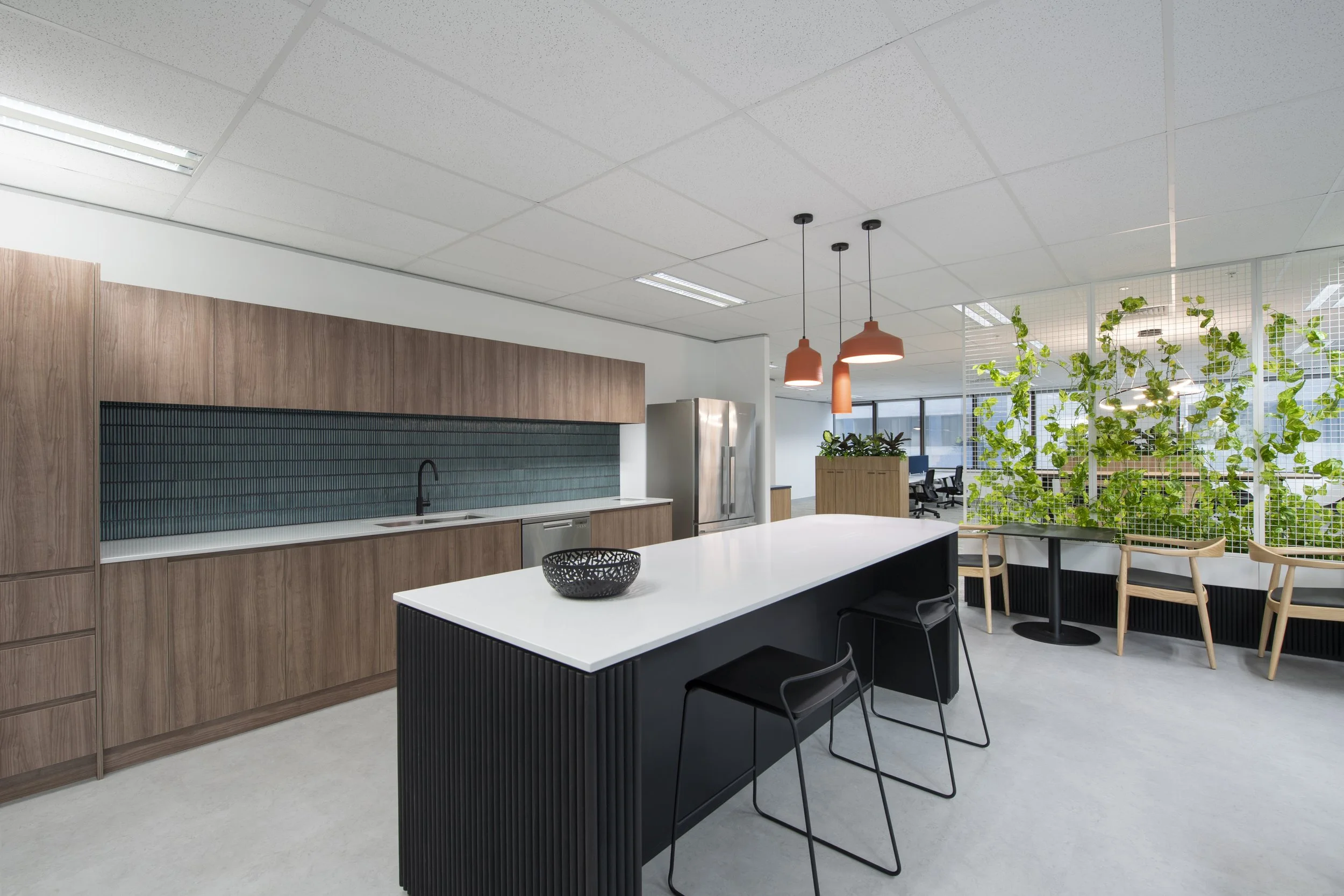 The Level 5 half-floor tenancy was designed to deliver a bold point of difference within a compact yet highly functional footprint. A series of custom-made screens with integrated planter boxes create subtle spatial separation while introducing greenery and texture throughout the workplace. These planter barriers soften sightlines, enhance privacy, and contribute to a more dynamic and engaging environment.